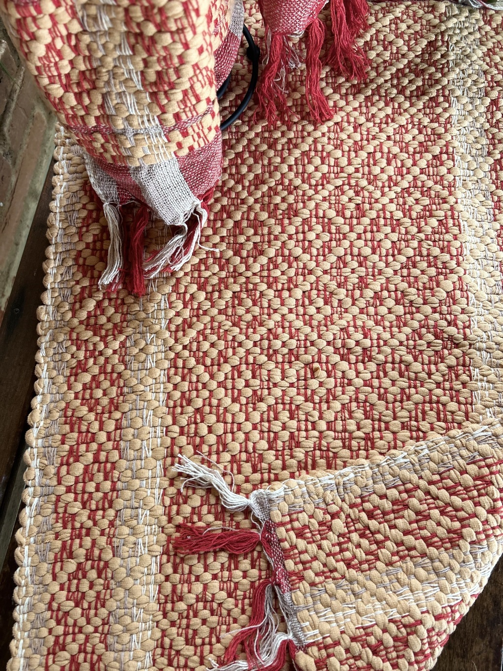 Kit Lavabo com 2 peças produzidas de forma artesanal em tear manual e acabamento em franja. Toalha tamanho rosto com detalhes trabalhados e tapete em fio de algodão.