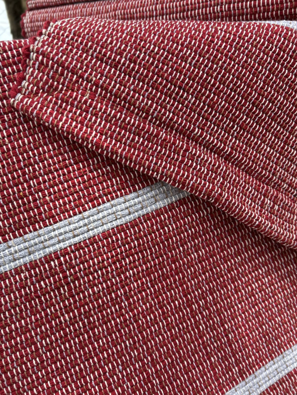 O jogo Encanto contém 3 peças na cor vermelha com listras na cor cinza, nas seguintes medidas: 1 passadeira 1,45x0,47m 2 tapetes 0,70x0,47m
